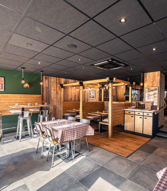 Ce restaurant traditionnel allie charme contemporain et ambiance chaleureuse grâce à sa décoration bois moderne.